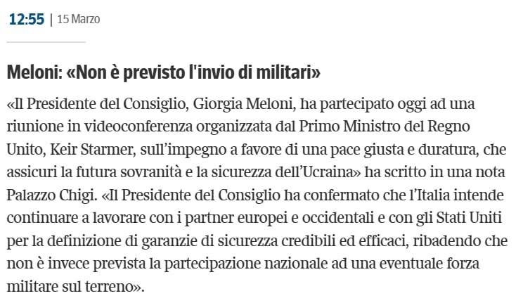 "Прем’єр-міністр підтвердила, що Італія збирається продовжити співпрацю з європейськими та західними партнерами, а також зі Сполученими Штатами для розробки надійних і дієвих гарантій безпеки, при цьому наголосивши, що участь країни в можливих військових силах на місцях не передбачено", - йдеться в заяві пресслужби.