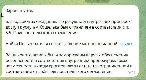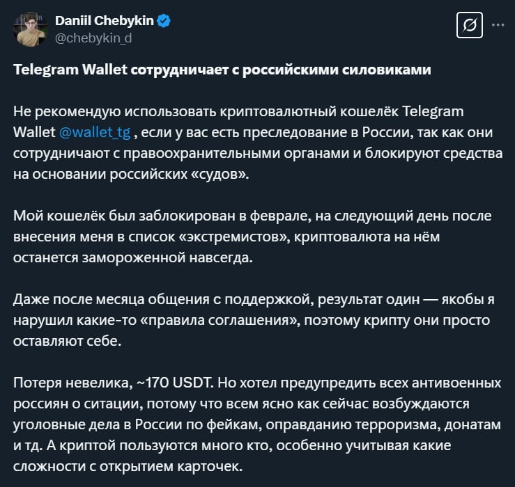 За словами Чебикіна, його криптовалюта була заблокована в «Гаманці» наступного дня після того, як він потрапив до списку «екстремістів» Росфінмоніторингу. Вивести кошти «Гаманець» не дозволив.
