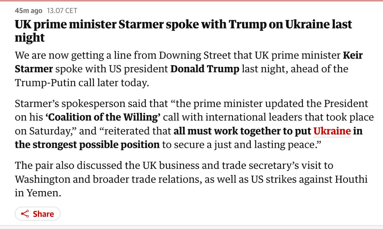 Представник Стармера заявив, що «прем’єр-міністр поінформував президента про його розмову телефоном з міжнародними лідерами у рамках «Коаліції охочих», яка відбулася в суботу», і «підкреслив, що всі мають працювати разом, щоб зміцнити позиції України в інтересах досягнення справедливого та тривалого миру».