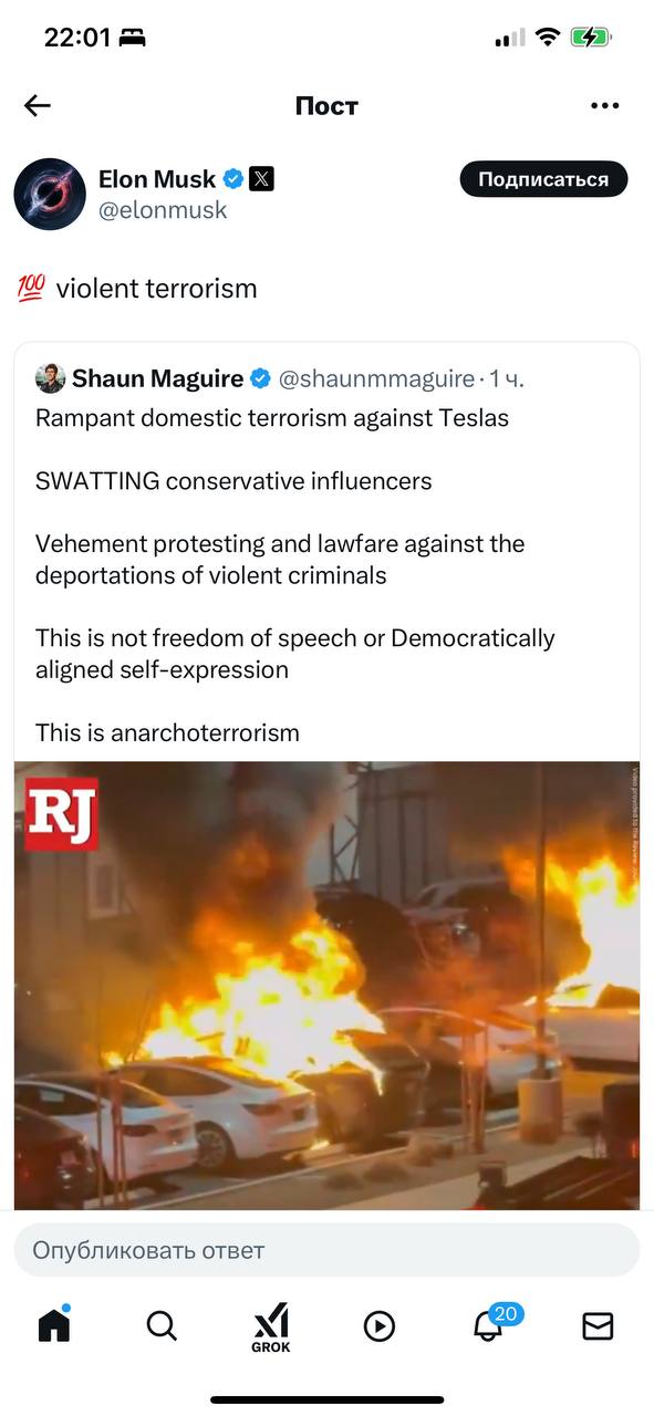 Ілон Маск, засновник компанії Tesla, засудив інцидент, назвавши підпал «тероризмом». У своїй заяві він підкреслив, що цей акт є спробою порушити нормальну роботу компанії та завдати шкоди її репутації. Маск також висловив підтримку працівникам Tesla в Лас-Вегасі та запевнив, що компанія вживе всіх необхідних заходів для розслідування інциденту.