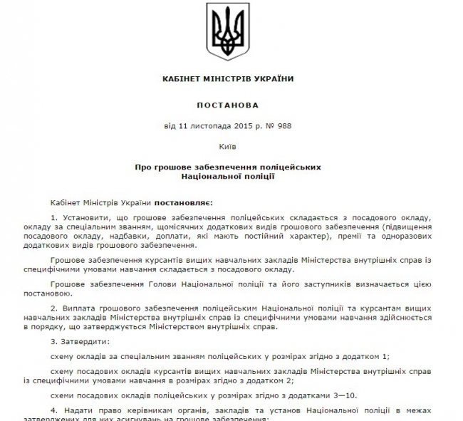 Впрочем, 11 ноября Кабмин утвердил постановление №988 "О денежном обеспечении полицейских Национальной полиции", где содержатся конкретные цифры в том числе по должности Деканоидзе.