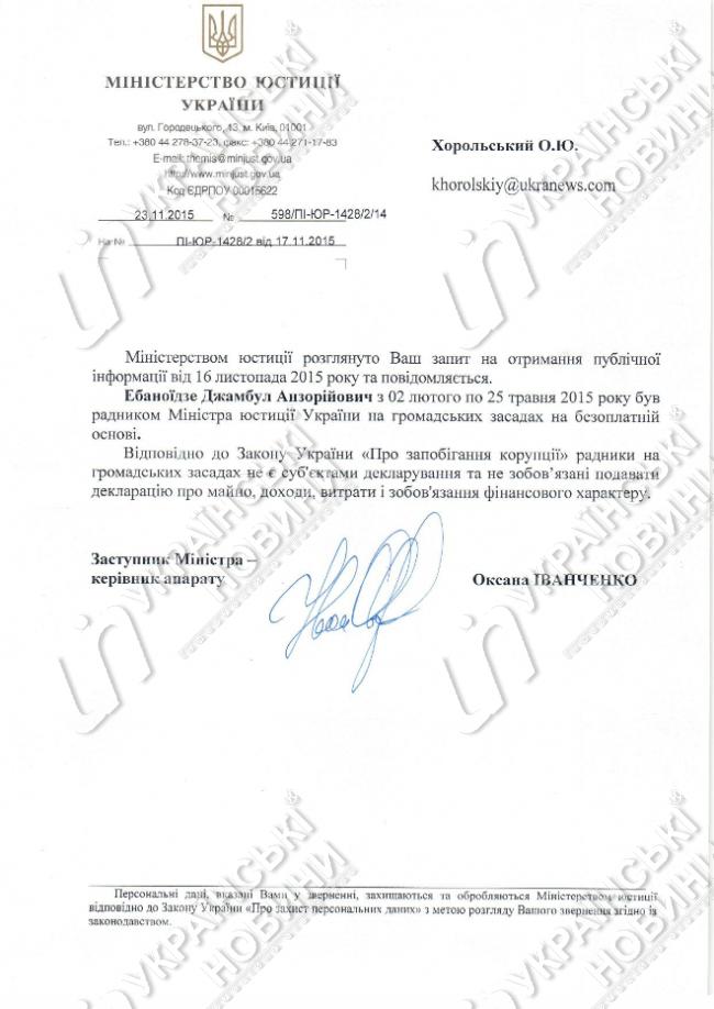 В ответе же Минюста утверждается, что все это время Эбаноидзе проработал советником министра "на общественных началах" и ни каких доходов он не получал вовсе.