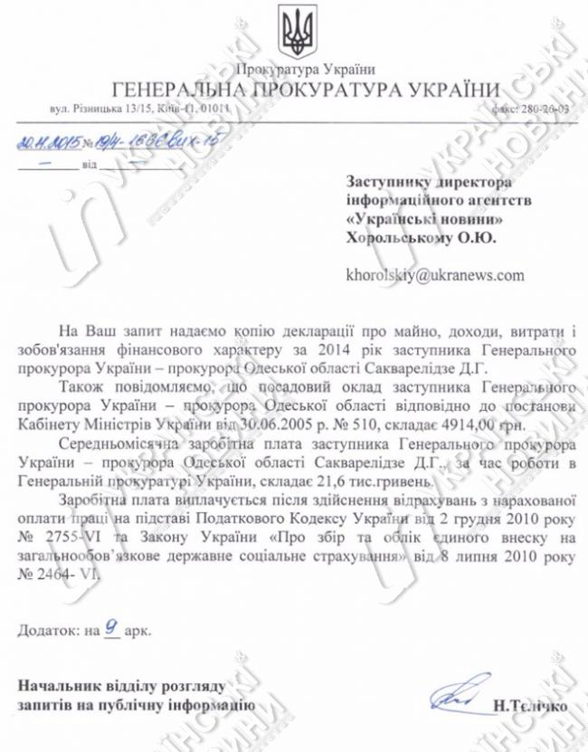 Занимающий сразу две прокурорских должности - заместителя Генерального прокурора Украины и Прокурора Одесской области - Давид Сакварелидзе получает должностной оклад в 4 914 грн. При этом, основной его доход составляют начисляемые на оклад надбавки и премии. Вместе с ними зарплата Сакварелидзе в Украине в среднем составляет уже вполне пристойные 21 600 грн в месяц.