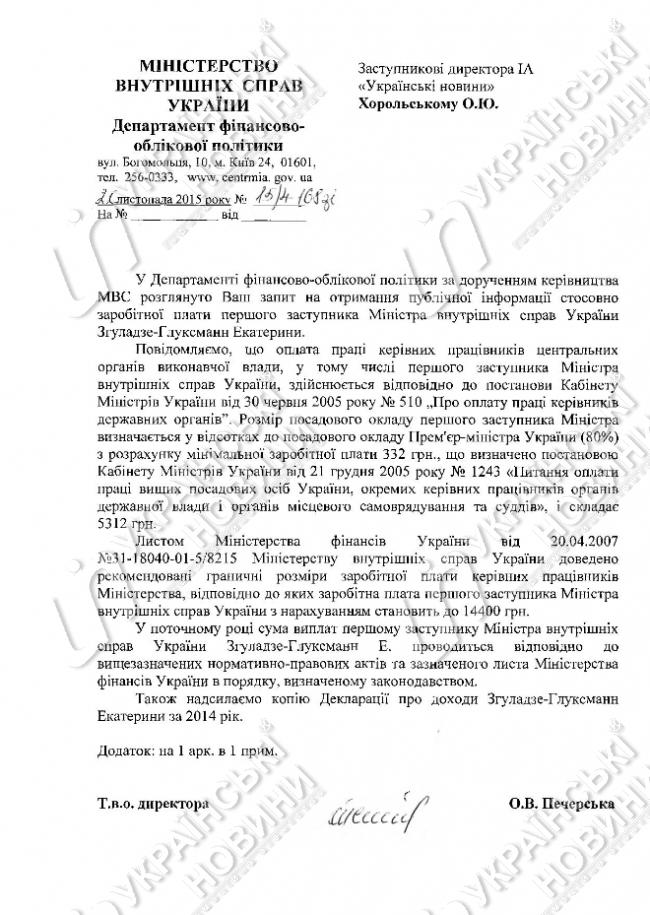 При этом в ответе МВД сообщается, что о зарплате Деканоидзе не могут пока ничего сообщить, поскольку она не получала зарплату до утверждения Кабмином постановления о денежном обеспечении сотрудников Национальной полиции.
