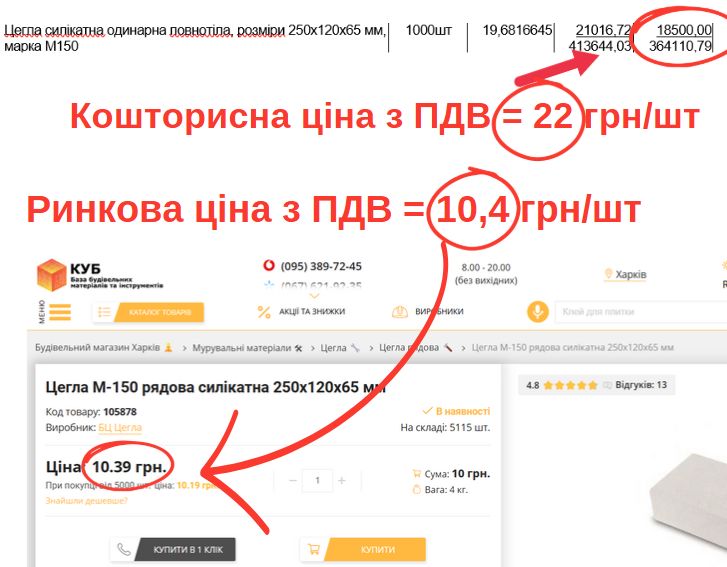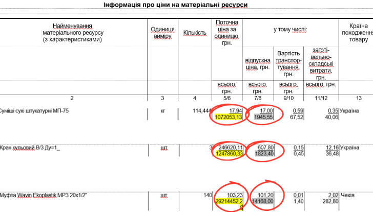 Крім того, у кошторисі є позиції, які містять помилки. Приміром, 114 кг штукатурної суміші МП 75 по 17,94 грн/кг мали би в сумі обійтися в 2 053,12 грн, натомість вписана загальна вартість в 551 раз більше – 1,07 млн грн. Відпускна ціна трьох кранів - 607,80 грн/шт із доставкою і зберіганням - мала б становити 620,11 грн/шт, а загалом на них мало би припадати 1860,33 грн. але в кошторисі поточна ціна чомусь складає 247 тис грн/шт, а загальна сума – 1,25 млн грн.