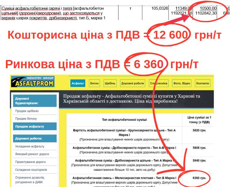Асфальтобетон щільний дрібнозернистий типу Б марки 1 врахували по 12 600 грн/т. Завод «АБ Столичний» пропонує його по 5 160 грн/т, а «Асфальтпром» – по 6 360 грн/т, що мінімум дешевше вдвічі.