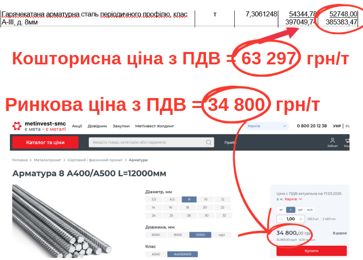 Арматурну сталь класу періодичного профілю А-ІІІ діаметром 8 мм заклали по 63 298 грн/т. Фірма «Метінвест СМЦ» пропонує її у Харкові по 34 800 грн/т, а столична компанія «Аякс»– по 30 700 грн/т, що дешевше вдвічі.