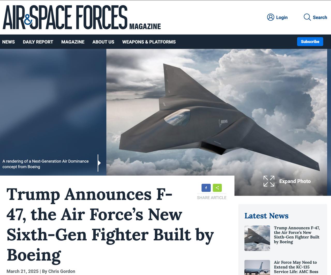 Трамп повідомив, що Boeing здобув перемогу над Lockheed Martin у конкурсі на створення пілотованого винищувача шостого покоління - F-47, повідомляють спеціалізовані ЗМІ.