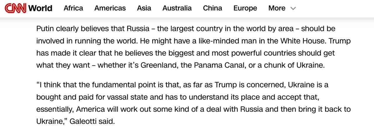 «Я вважаю, що принциповий момент полягає в тому, що з погляду Трампа Україна виступає як куплена й оплачена васальна держава, вона повинна усвідомлювати своє становище і прийняти, що, по суті, Америка виробить якусь домовленість з Росією, після чого поверне її (Росію. — Ред.) назад в Україну», — зазначив Галеотті.
