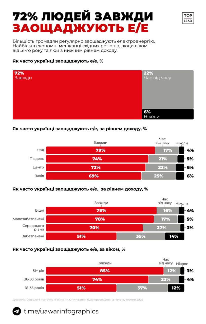 72% українців регулярно економлять електроенергію. Лише 6% ніколи не економлять, – інфографіка.