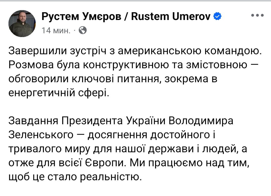 "Завершили зустріч з американською командою. Розмова була конструктивною та змістовною — обговорили ключові питання, зокрема, в енергетичній сфері", - заявив міністр оборони.