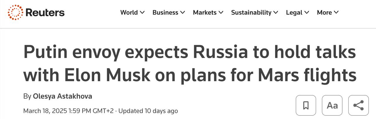 Спеціальний представник Путіна з інвестиційно-економічного співробітництва з закордонними країнами Кирило Дмитрієв заявив, що Росія готова запропонувати Ілону Маску малогабаритну атомну електростанцію для його місії на Марс.
