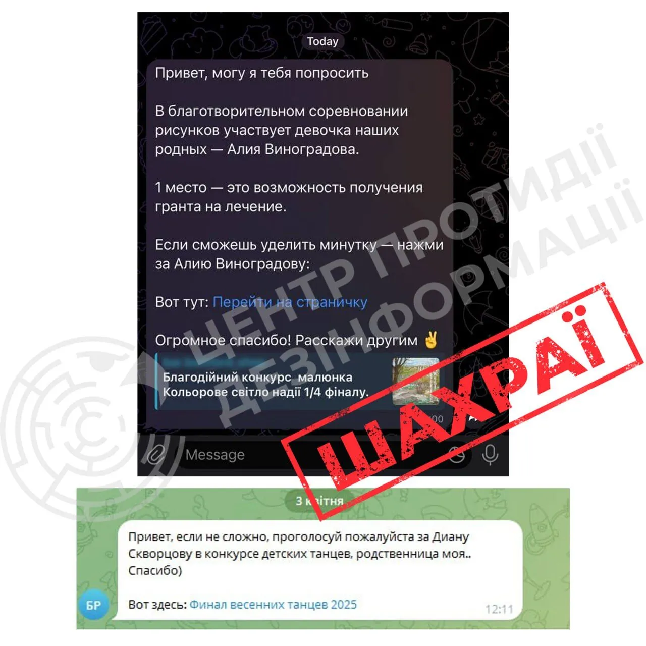 Також у Telegram повернулася вже досить стара схема. Йдеться про повідомлення, в яких користувачів просять проголосувати, наприклад, у дитячому танцювальному конкурсі або конкурсі малюнків.