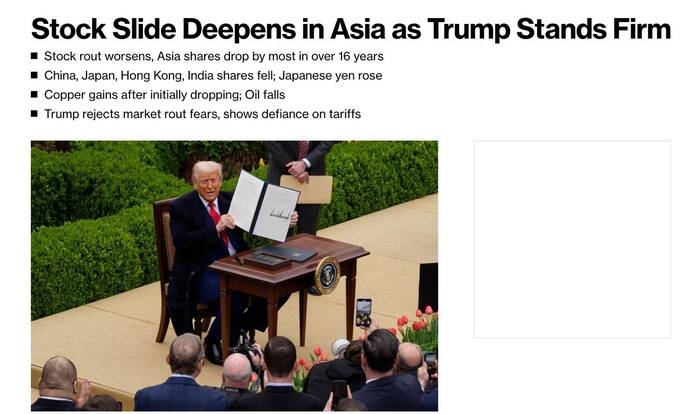 За інформацією Bloomberg, після запровадження тарифів Трампом і відповідних заходів Китаю індекс MSCI Asia Pacific знизився на 7,1%, що стало найгіршим показником з часів світової кризи 2008 року.