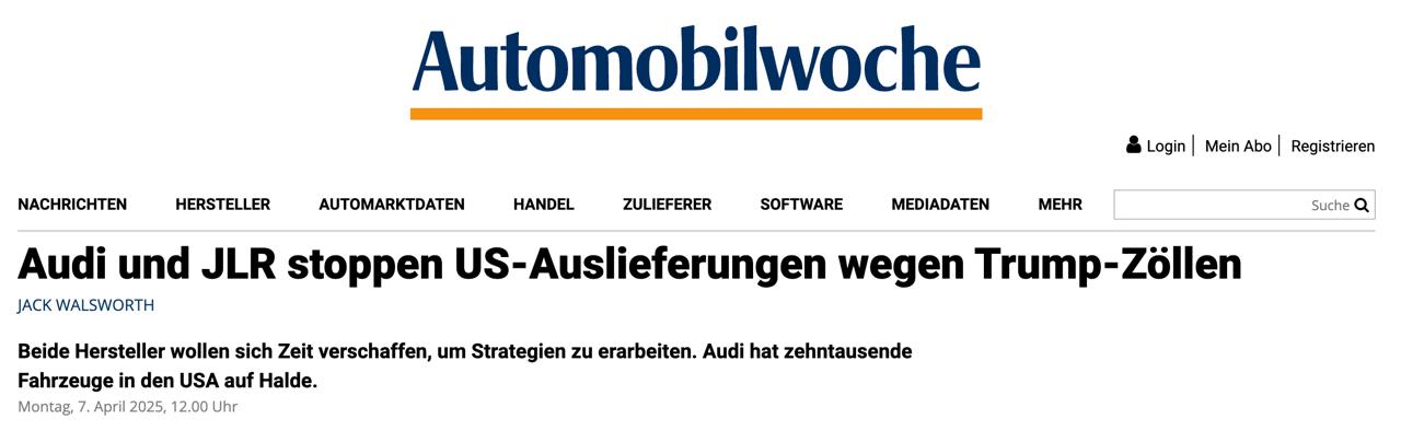 Німецьке профільне видання Automobilwoche повідомляє, що автовиробники Audi та Jaguar Land Rover (JLR) припиняють постачання автомобілів до США. Причиною стали нові 25% імпортні мита на європейські автомобілі, введені адміністрацією Дональда Трампа.