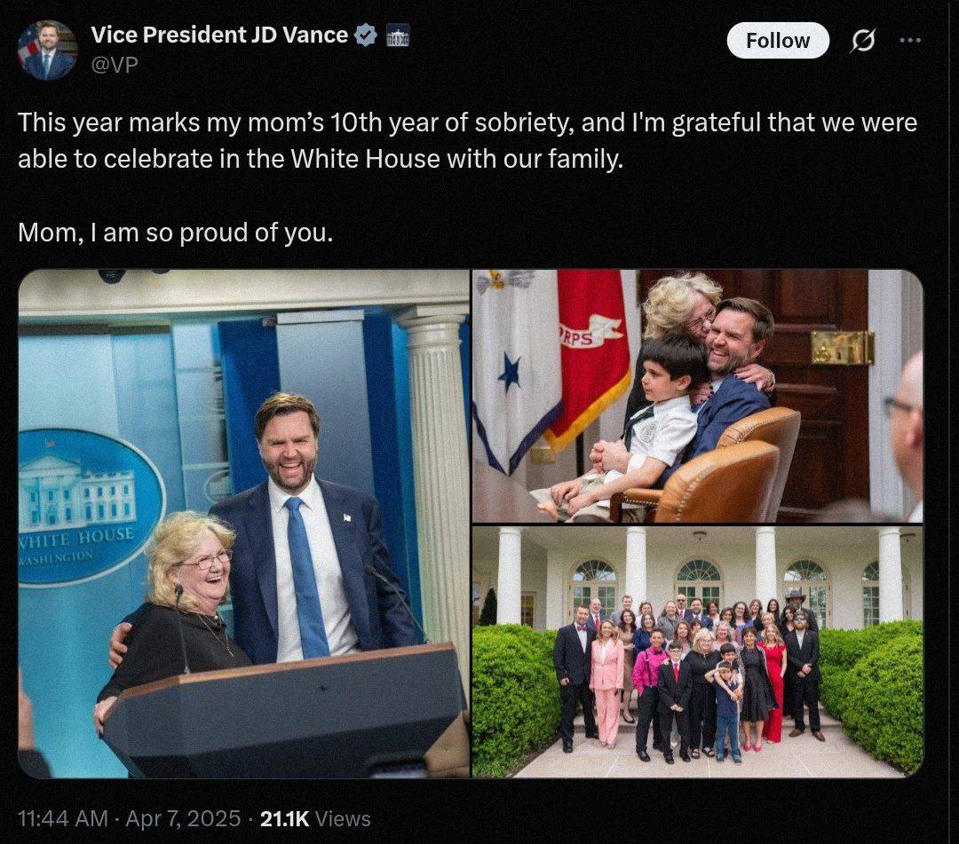 «Цього року виповнюється 10 років тверезості моєї мами, і я вдячний, що ми змогли відсвяткувати це в Білому домі з нашою родиною. Мамо, я так пишаюся тобою», – написав Венс.
