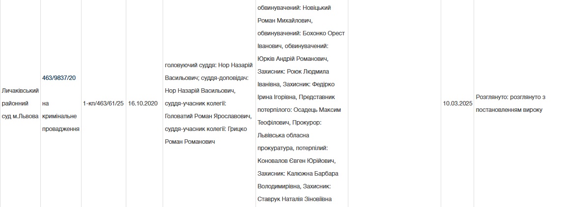 Личаківський районний суд у місті Львові визнав доведеною вину у вчиненні навесні 2020 року умисного вбивства з корисливих мотивів (п.п. 6, 12 ч.2 ст.115 КК України) під час скоєння розбійного нападу (ч.2 ст.187 КК України) на місцевого валютника Віктора Дикуна. Було засуджено до 15 років позбавлення волі з конфіскацією майна виконавців зухвалого злочину - 53-річного уродженця Донеччини Ореста Бохонка й на рік старшого львів’янина Романа Новіцького. Відповідний вирок 10 березня 2025 року постановила колегія суддів у складі головуючого судді Назарія Нора та суддів-учасників: Романа Головатого й Романа Грицка.