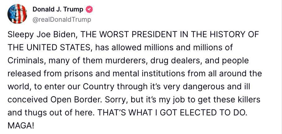 "Сонний Джо Байден, найгірший президент в історії США, дозволив мільйонам злочинців, багато з яких вбивці та торговці наркотиками, в’їхати до нашої країни. Моя робота — вигнати звідси цих вбивць і головорізів. Ось для чого мене обрали", — написав Трамп.