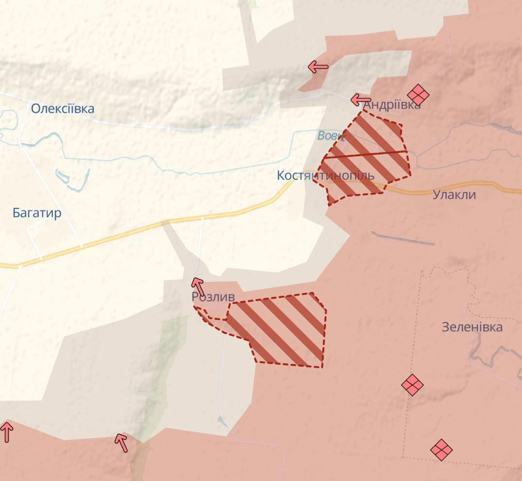 Згідно з оновленими даними карти бойових дій, ворог закріпився в районі населеного пункту Костянтинопіль, який розташований на трасі в напрямку Запоріжжя. Також фіксується просування противника південніше — в районі селища Розлив.