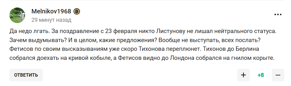 "Нашій дівчинці, гімнастці Вікторії Лістуновій, за те, що вона привітала тата чи дідуся з 23 лютого, навіть не дозволили виступати в нейтральному статусі. Це що за нісенітниця, вибачте? До якого рівня ми маємо принижуватися, щоб нам дозволили позмагатися десь?" - емоційно сказав Фетісов в інтерв’ю "Комсомольській правді".