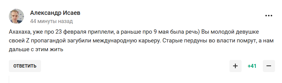 "Ахахаха, вже про 23 лютого приплели, а раніше про 9 травня була мова. Ви молодій дівчині своєю Z-пропагандою занапастили міжнародну кар’єру. Старі керівники у владі помруть, а нам далі з цим жити", - пишуть росіяни.