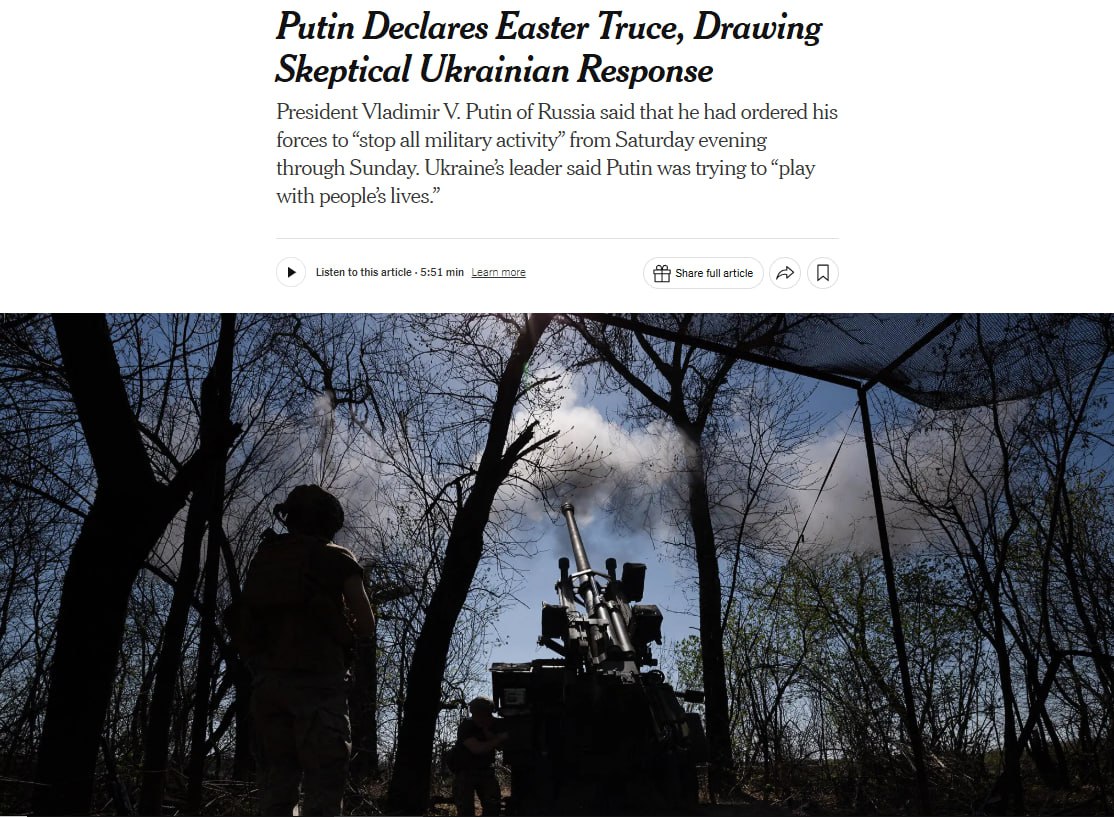 "Для Путіна пропозиція про перемир’я може переслідувати дві цілі: продемонструвати президенту Трампу, що Росія робить кроки до миру, і поставити пана Зеленського в складне становище. Якщо Україна відмовиться виконувати його, Трамп може звинуватити Україну у перешкоджанні заходам щодо припинення війни. Якщо ж Україна його виконає, багато українців побоюються, що Росія може використати паузу, щоб перемістити війська на стратегічно вигідні позиції", — йдеться в статті.