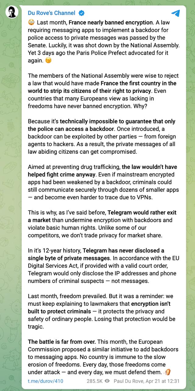 Павло Дуров попереджає, що подібне втручання не лише не захистить людей, а, навпаки, поставить під загрозу їхню безпеку. За його словами, шифрування — це не захист для злочинців, а необхідна умова для конфіденційності звичайних користувачів.