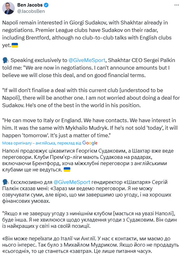 "Зараз ми ведемо переговори. Я не можу озвучувати суми, але вірю, що ми завершимо цю угоду і зробимо це на хороших фінансових умовах. Якщо ми не досягнемо угоди щодо поточних переговорів із "Наполі", буде інша. Я не хвилююся про трансфер Судакова. Він один із найкращих у світі на своїй позиції. Якщо ми не продамо його сьогодні, то зробимо це завтра. Це лише питання часу", – розкрив деталі Палкін.