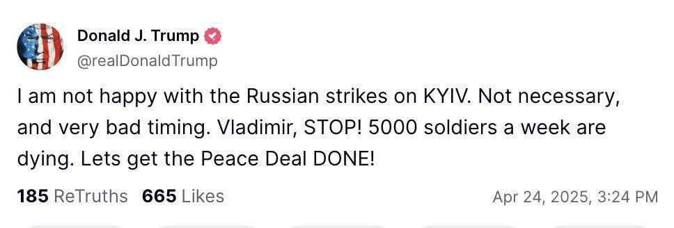 «Мене не влаштовують атаки Росії на Київ. Це було абсолютно зайвим і дуже недоречним. Володимире, припини! Кожного місяця втрачається 5000 солдатів. Давайте нарешті досягнемо мирної угоди!» - зазначив Трамп.