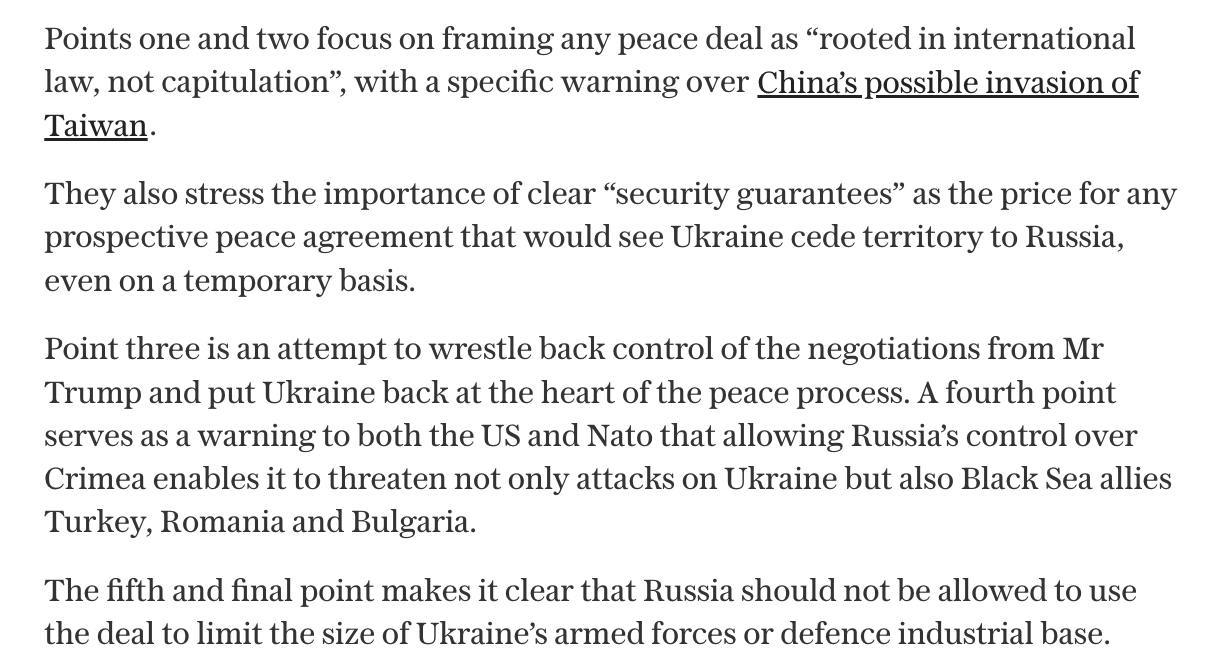 Третій пункт передбачає посилення контролю України над переговорами та повернення Києва в центр мирного процесу. Четвертий пункт спрямований на попередження США і НАТО, що визнання Росією контролю над Кримом створить загрозу не лише для України, але й для союзників по Чорному морю — Туреччини, Румунії та Болгарії.