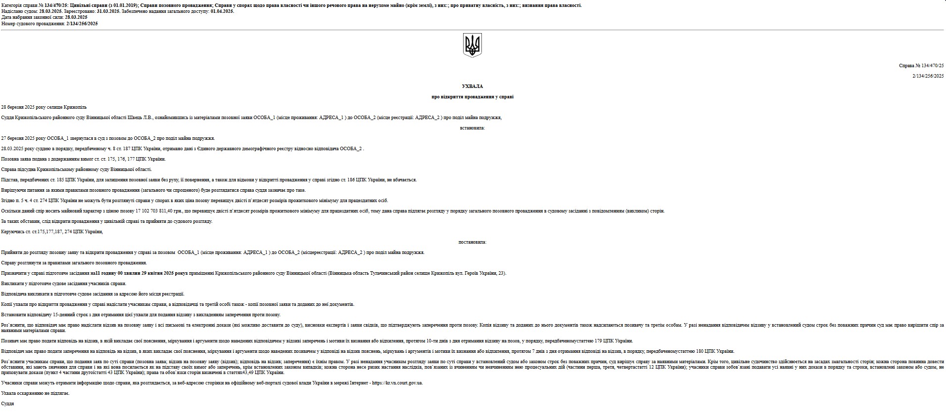 Позов стосується поділу майна подружжя. Справа підсудна Крижопільському районному суду Вінницької області, куди і було подано позов.