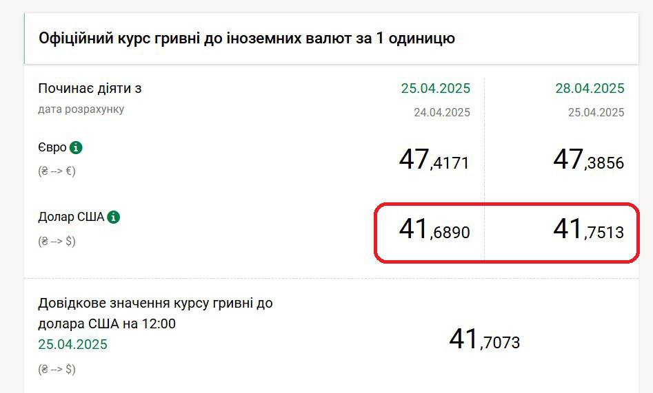 У цій ситуації Нацбанк за тиждень підняв офіційний курс долара з 41,3955 грн/$ (на 21 квітня) до 41,7513 грн/$ (на 28 квітня), що становить 36 копійок. Востаннє курс Нацбанку був так високо 16 лютого — на рівні 41,7996 грн/$, але вже 17 лютого він знизився до 41,6299 грн/$ і згодом більше так високо не підіймався.