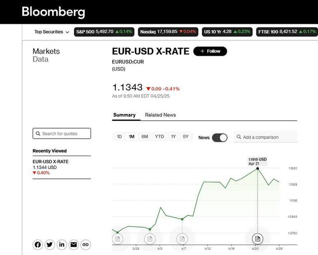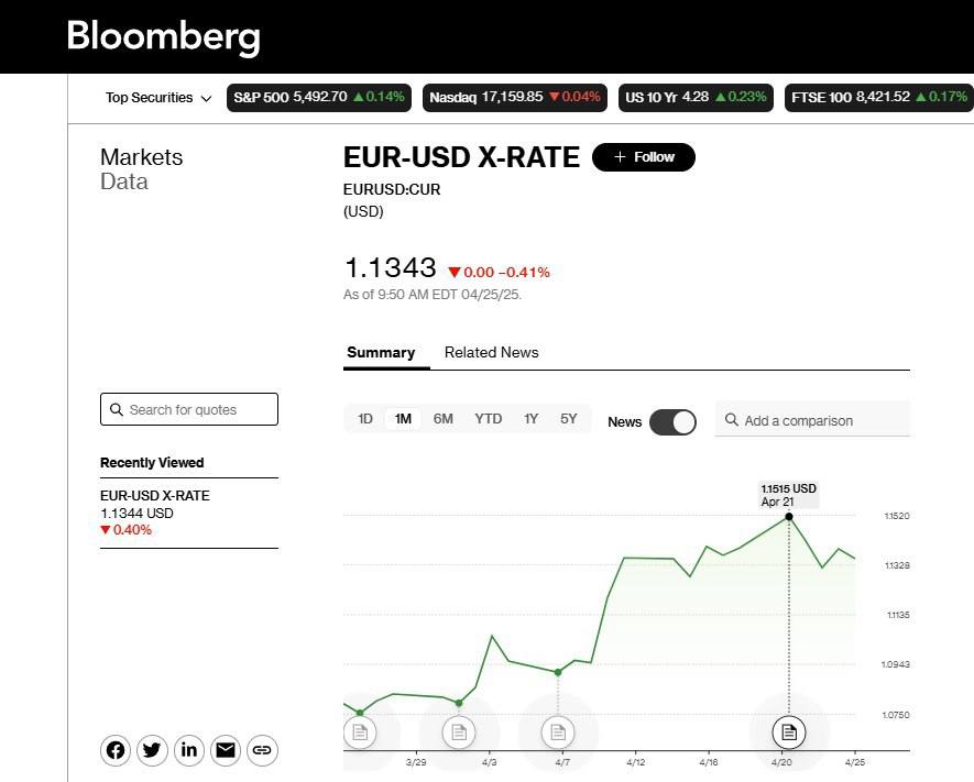 Офіційний курс гривня/євро починав тиждень на рівні 47,0253 грн/€ (21 квітня), досяг у вівторок (22 квітня) 47,7653 грн/€, до п’ятниці (25 квітня) відкотився на 47,4171 грн/€, а на понеділок (28 квітня) вийшов до 47,3856 грн/€. Рух вгору пояснювалося різким подорожчанням європейської валюти на світовому ринку на тлі торгівельної війни, розпочатої Трампом. міжнародне котирування євро/долар цього тижня досягало максимуму 1,1515 і знижувалося до 1,1316.