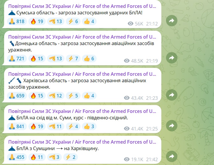"Харківська область - загроза застосування ударних БпЛА", - повідомлялося о 19:34.