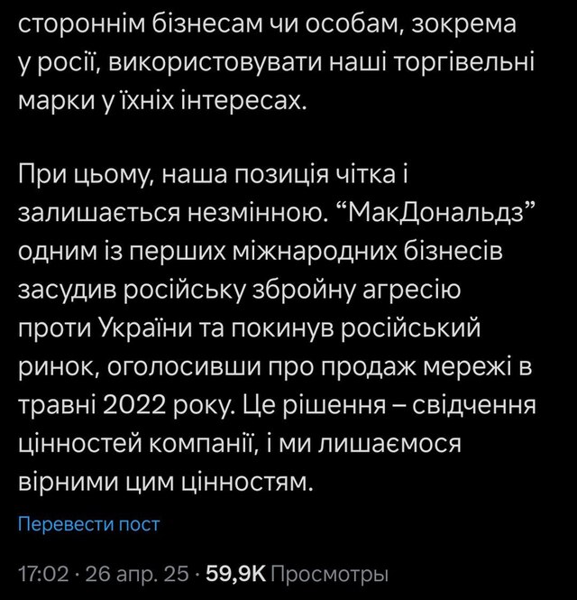 У McDonald’s заявили, що перереєстрація в РФ потрібна для запобігання крадіжці інтелектуальної власності