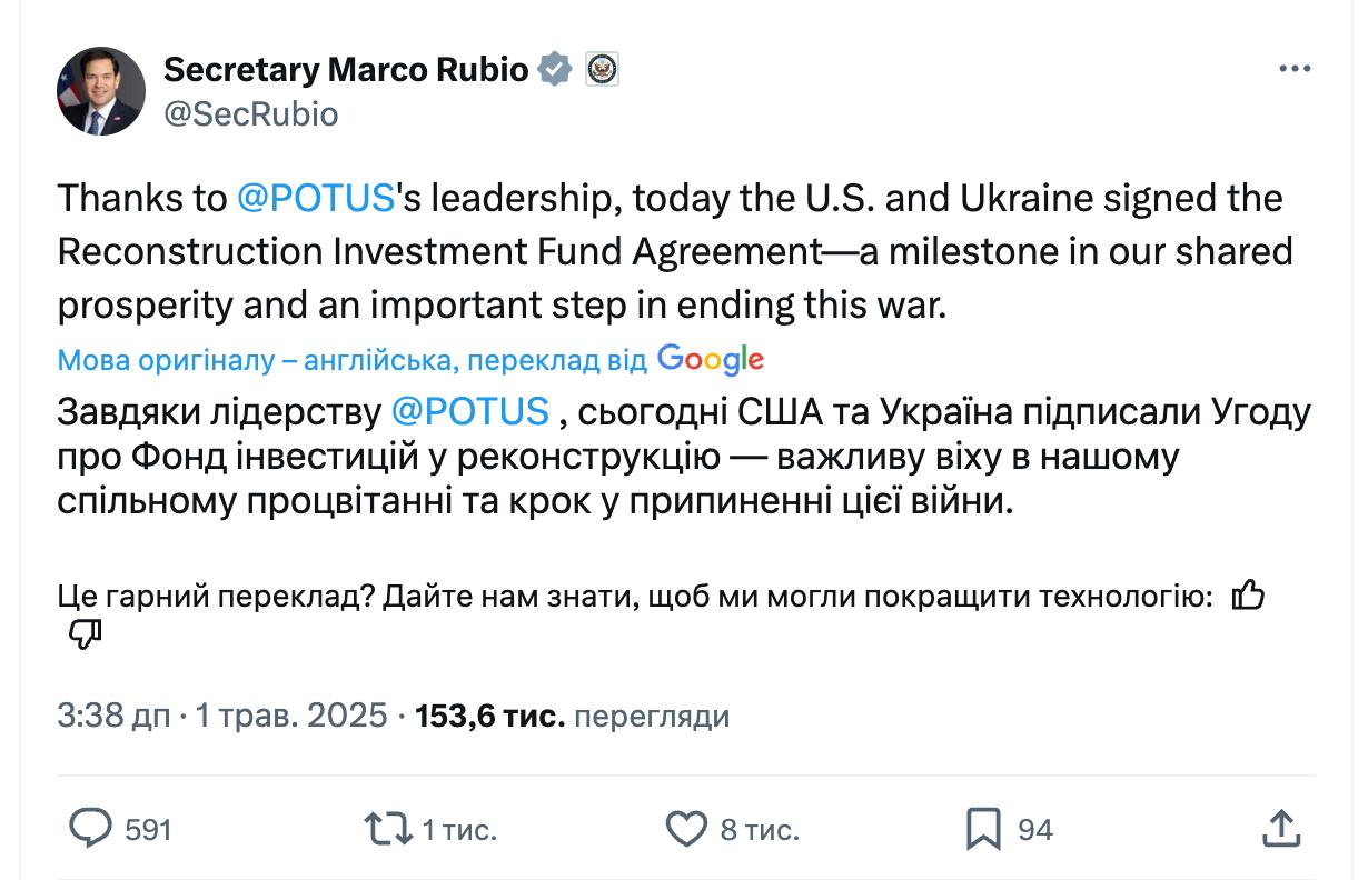 Державний секретар Марко Рубіо назвав підписану в середу угоду між Україною та США "кроком до завершення війни".