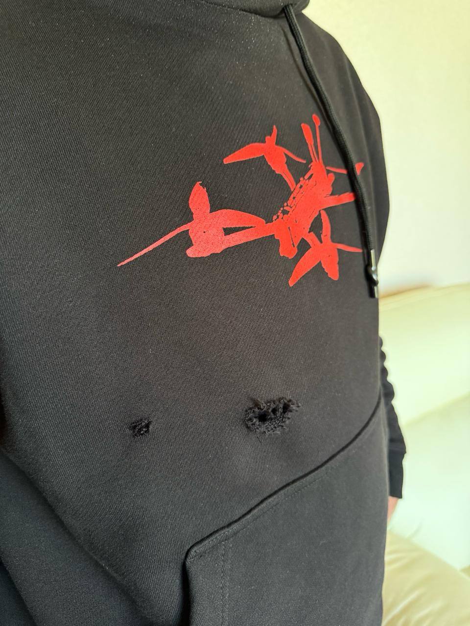 "Одному з охоронців пощастило ще більше за мене. Цю кофту куля прошила, але сам він абсолютно цілий. Буквально диво", — написав активіст.