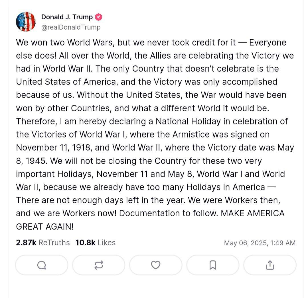 "У всьому світі союзники святкують нашу перемогу у Другій світовій війні. Єдина країна, яка не святкує, – це США, і ця перемога була досягнута тільки завдяки нам".