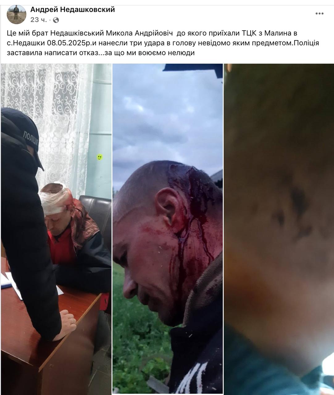 За словами Андрія, інцидент стався 8 травня 2025 року в селі Недашки, коли представники ТЦК з Малина приїхали до його брата і завдали йому три удари по голові невідомим предметом. На опублікованих фотографіях видно, як чоловік з закривавленою головою стоїть під наглядом поліції, яка вимагає від нього написати відмову.