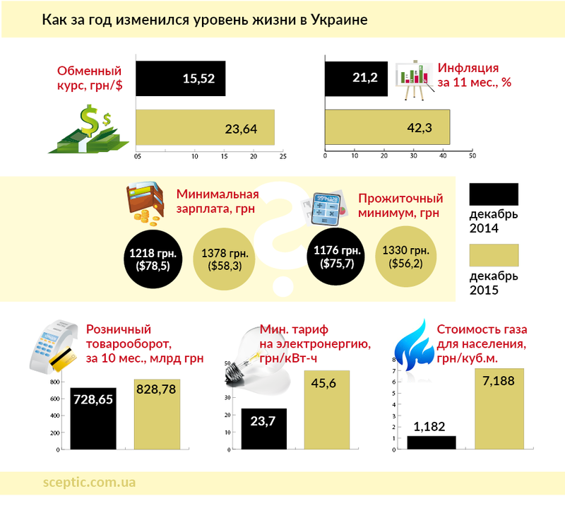 О том, какой ценой дались эти успехи, красноречиво свидетельствуют цифры государственной статистики. С декабря 2014 г. гривна подешевела в полтора раза, что немедленно сказалось на покупательной способности украинцев. В долларовом эквиваленте минимальная зарплата, несмотря на небольшое повышение, сократилась в 1,3 раза. Соответственно, подорожала потребительская корзина. Реальный прожиточный минимум вдвое больше официально установленного. Что признают и в правительстве. А за избавление от газовой зависимости теперь нужно платить в шесть раз больше.