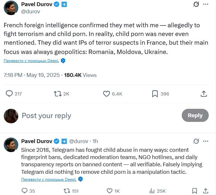 «Французька зовнішня розвідка підтвердила, що вони зустрічалися зі мною – нібито для боротьби з тероризмом і дитячою порнографією. Насправді дитяча порнографія навіть не згадувалась. Їх цікавили IP-адреси підозрюваних у тероризмі у Франції, але справжньою метою була геополітика», – написав Дуров у соцмережі Х (колишній Twitter).