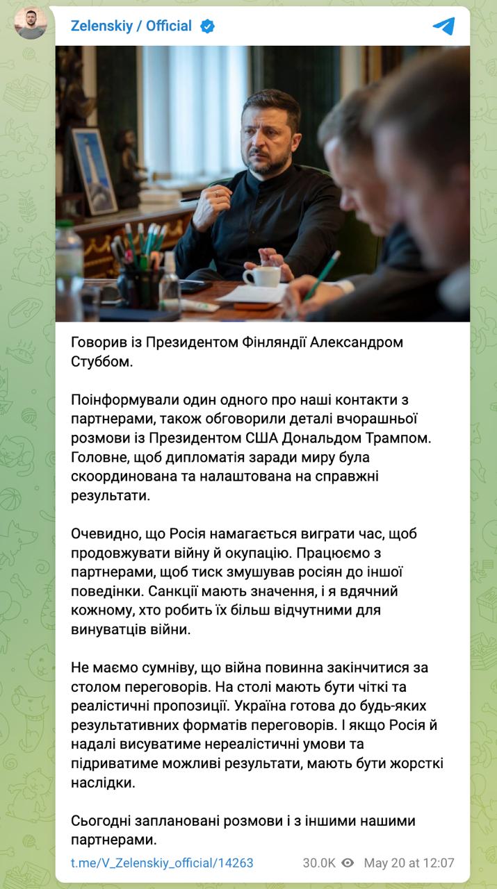 «Очевидно, що Росія прагне виграти час для продовження війни та окупації. Ми співпрацюємо з партнерами, щоб тиск сприяв зміні поведінки росіян. Санкції відіграють важливу роль. Якщо Росія продовжить наполягати на нереалістичних умовах і підривати можливі досягнення, повинні настати суворі наслідки», - заявив Зеленський.