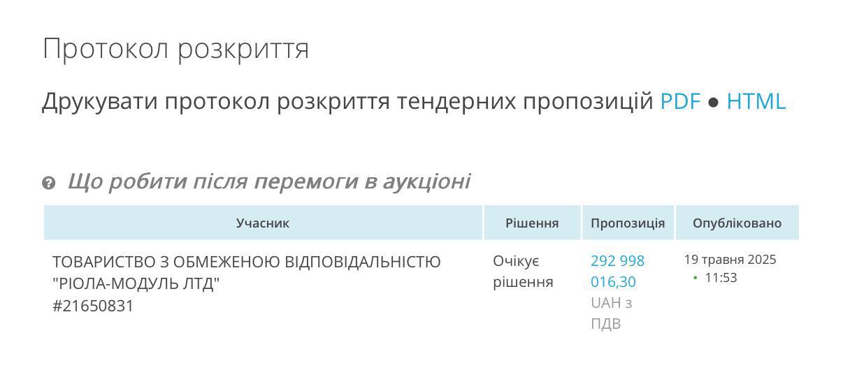 Його виграла ТОВ «Ріола-Модуль ЛТД», яка має статутний капітал усього 375 грн. Пропозиція компанії — 293 млн грн, що на 20% менше за очікувану вартість. Формально — економія. Але…