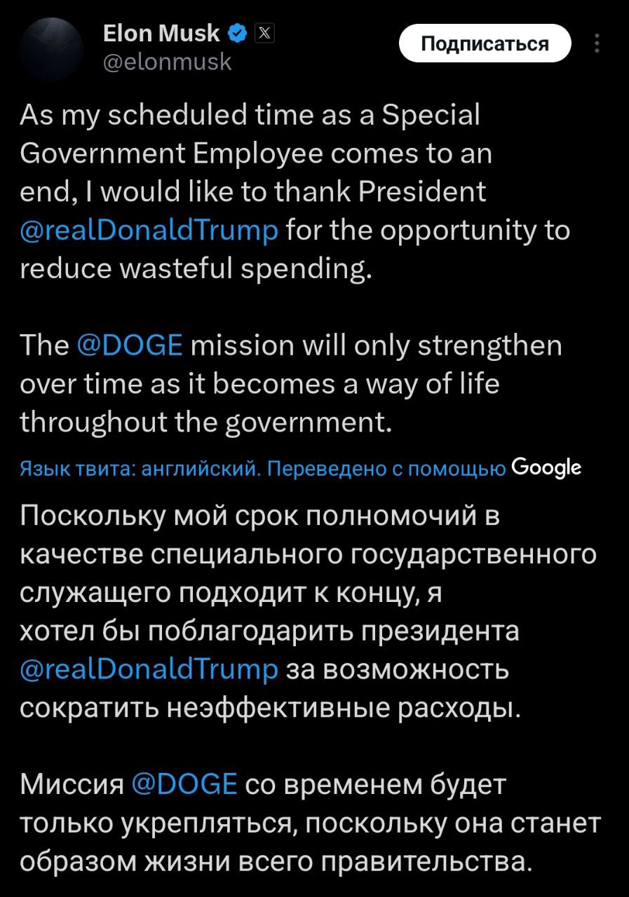 «У зв’язку із закінченням мого терміну як спеціального державного службовця хочу висловити подяку президенту Дональду Трампу за шанс зменшити неефективні витрати. З часом місія DOGE лише посилиться, ставши основоположним принципом у всіх державних структурах», - написав він у своїй соцмережі X.