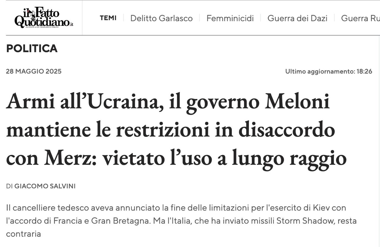 За інформацією Fatto Quotidiano, Рим продовжить надавати військову та гуманітарну підтримку Києву, проте на далекобійну зброю — включаючи ракети, здатні вражати цілі в глибині території РФ — поширюються внутрішні обмеження, які залишаються в силі.