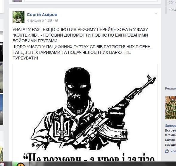 4 декабря Лесник-Аміров и вовсе разместил в Сети объявление, похожее на явку с повинной: "Если сопротивление режиму перейдет хотя бы в стадию "коктейлей", готов помочь полностью экипированными боевыми группами".