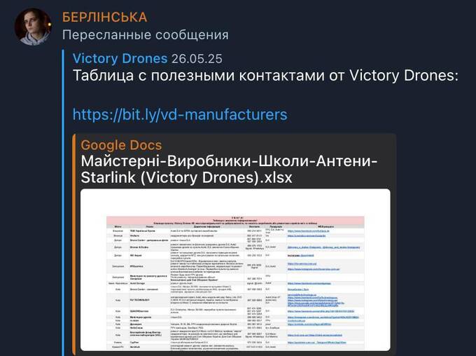 25 травня керований нею проєкт Victory Drones опублікував таблицю з телефонами та вебсторінками виробників дронів у різних містах України. Сама Берлінська зробила репост цієї таблиці у своєму Telegram-каналі.