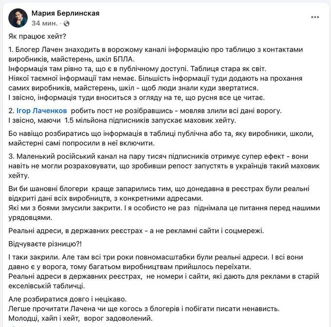 Вона ж відповіла, що таблиця стара і давно доступна публічно, а ворог про неї знає не перший рік. Також Берлінська звинуватила провладного блогера Лаченкова в розкручуванні цієї кампанії. Та критики не заспокоїлися.