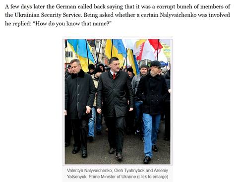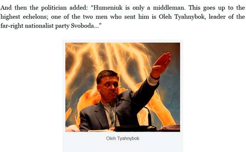 Картинки до тексту також цікаві. Тут головна «зірка» – Олег Тягнибок: то він буцімто віддає нацистське вітання з трибуни, то ручкається з американськими політиками, то стоїть поруч з президентом Порошенком. А ось і обидва фігуранти справи, Тягнибок та Наливайченко йдуть під прапорами разом з прем’єром Арсенієм Яценюком. Отак Артур Бранд мазнув брудом по усіх, до кого руці дотяглися. Як легко з подібних матеріалів розкручується всесвітня медіа-істерика, нині відомо кожному.
