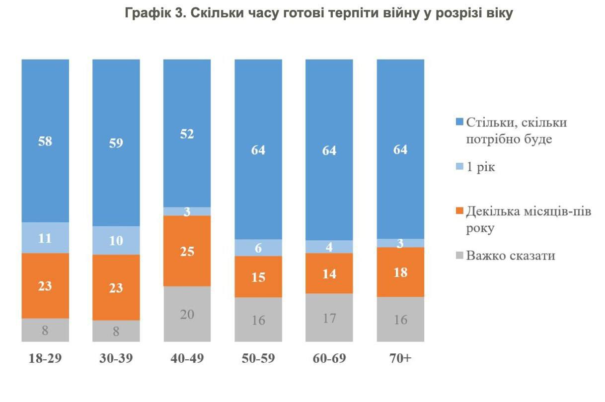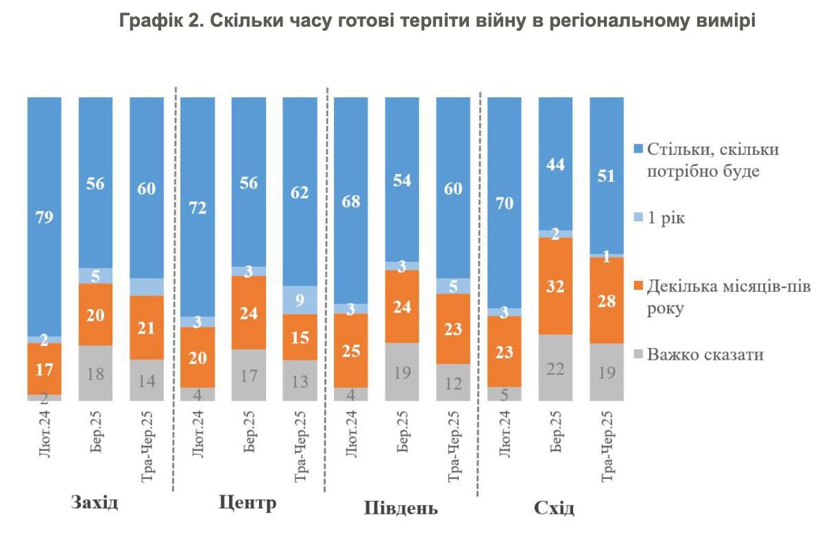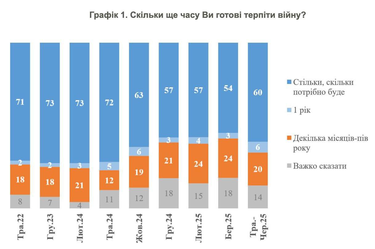 Водночас між березнем і травнем - початком червня 2025 року показник зріс і наразі 60% українців стверджують, що вони "готові терпіти стільки, скільки буде потрібно". Ще 6% готові терпіти 1 рік, тобто відносно довгий період.